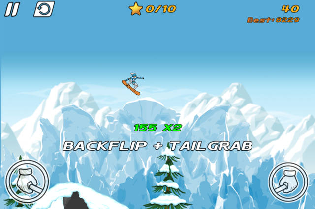 コースでは画面両サイド下に表示されるグラブマークをタッチ、空中で本体を傾けてバックフリップやフロントフリップなどを組み合わせてスタイルを出していきます。 |